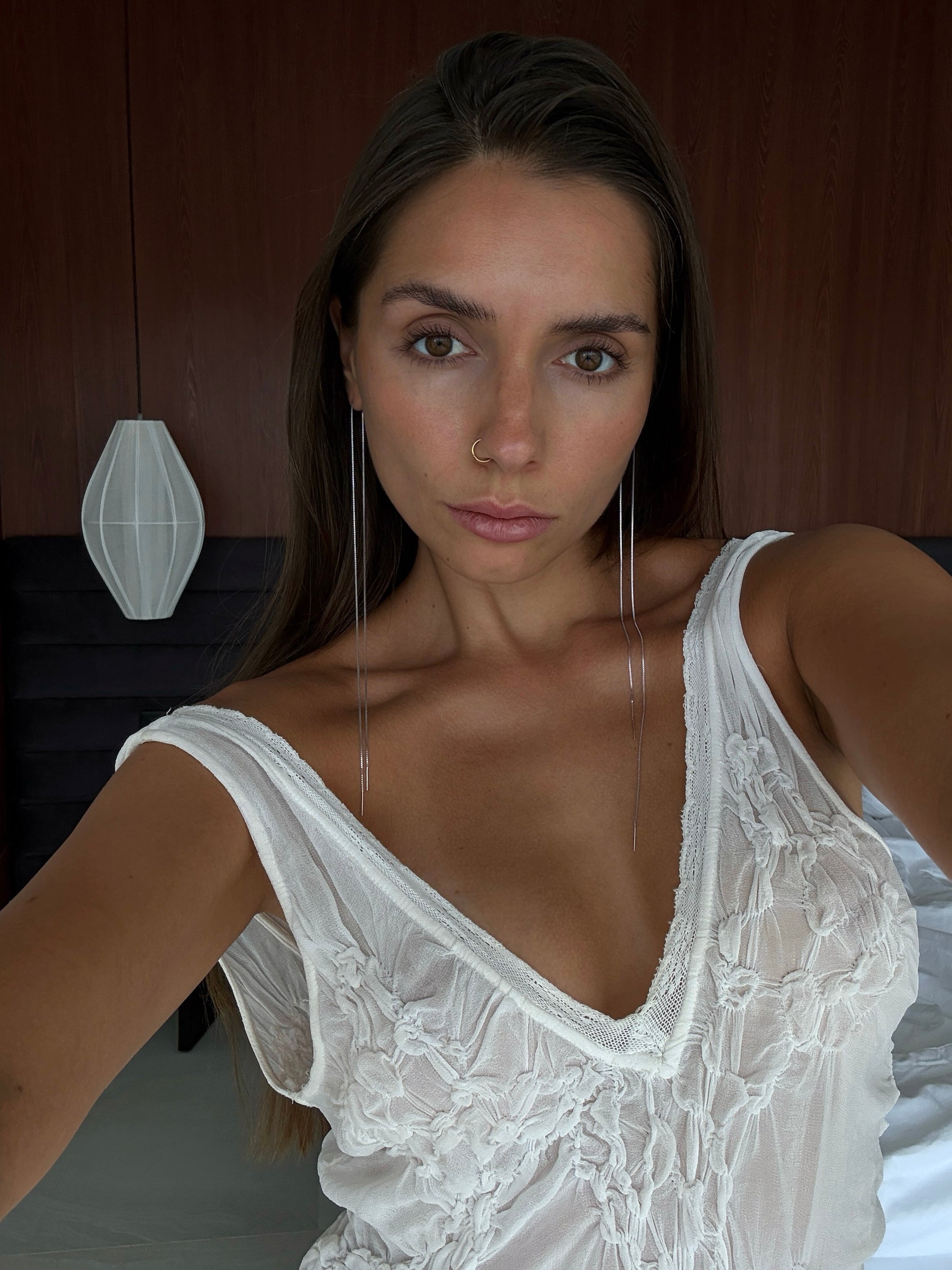 Minimalist and symmetrical earrings on a long chain. Perfect for layered looks and a refined, understand style